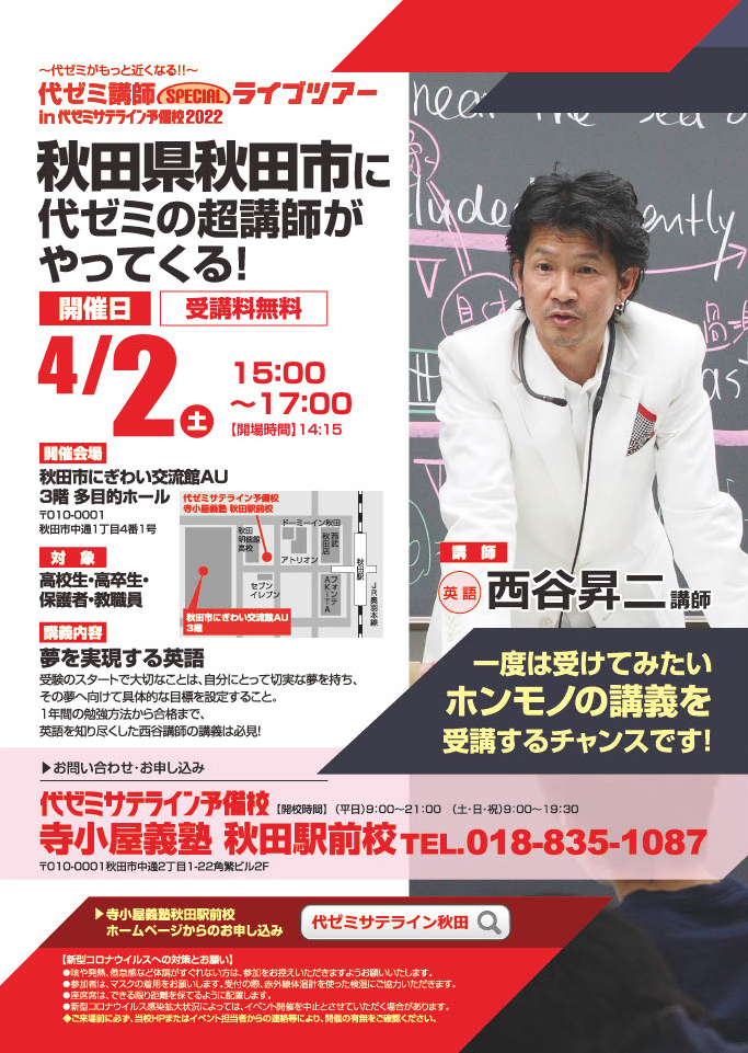 2022/03/09 12:35 4月2日(土)に西谷昇二講師が二年半ぶりに秋田で講義を行います!英語で高得点を獲得をする為の極意を伝授します。合格を掴む勉強方法等、大学受験の全てを知り尽くした西谷講師の講義を是非ライブで!お申込みは予約フォームからか直接... -